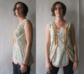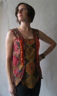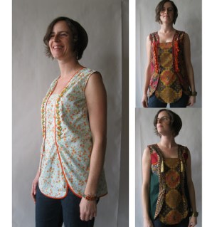 These tunic blouses, inspired by the free styles of the 1920’s and named for one of my favorite musical artists of all time, Memphis Minnie, feature a sleeveless, softly fitting shaped bodice, a square neckline, a petal-like layered curved hemline which overlaps the front center panel on either side, and vintage and/or contemporary fabrics and embellishments.