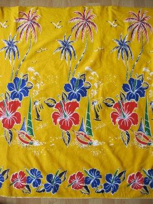 I’ve just come across some fabulous Hawaiian print and nautical print fabrics, which I’ll be listing today in my afterglow vintage fabric shop. These are the style of fabrics I’m the biggest sucker for: colorful vintage prints featuring people, boats, and island scenes!