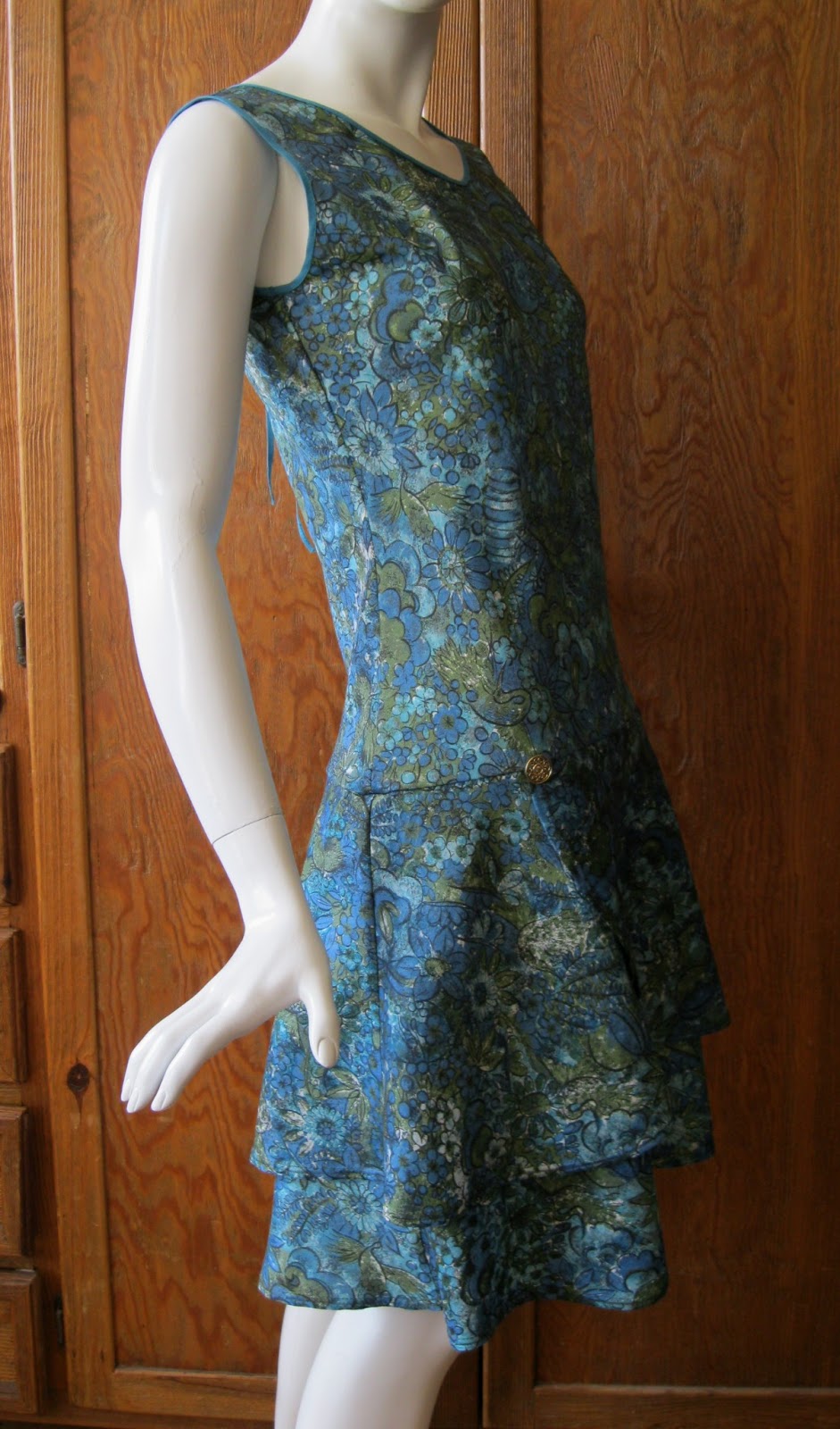 Here’s a custom Louise Dress I finished today for a client, in in teal and olive 1950’s/60’s bird and flower print taffeta, with goldtone filigree button and teal cotton binding, size small