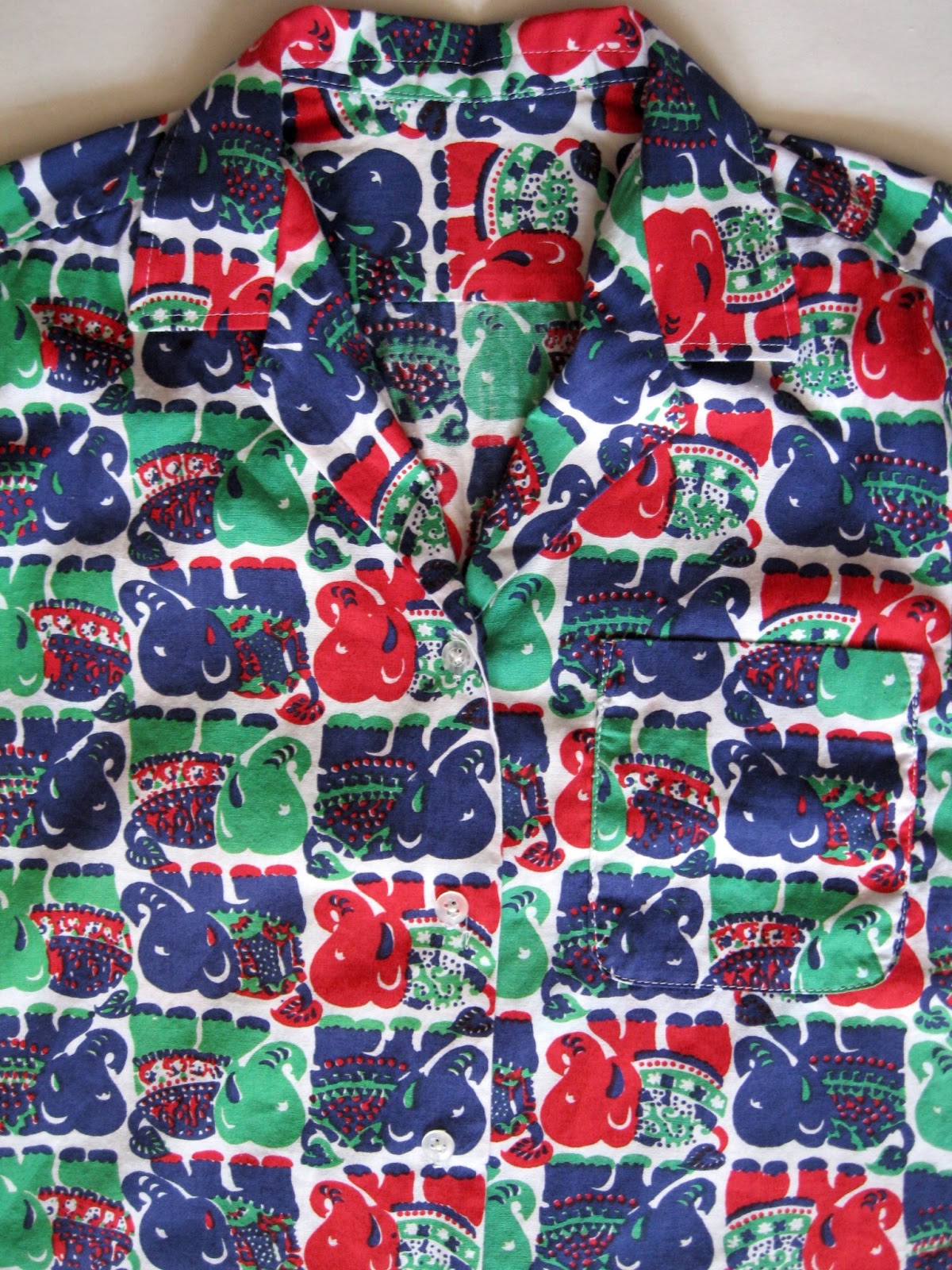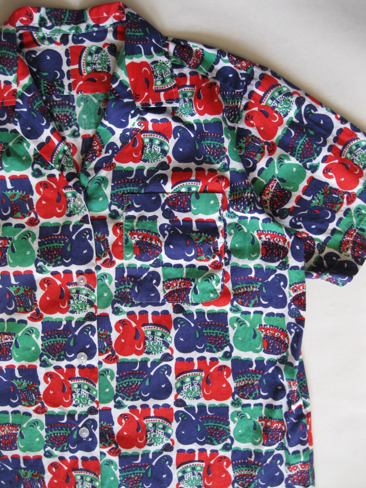 Super awesome 1960’s elephant print cotton shirt, in green, navy blue, and red on white, with button up front, one chest pocket, smallish notched collar, and straight hem